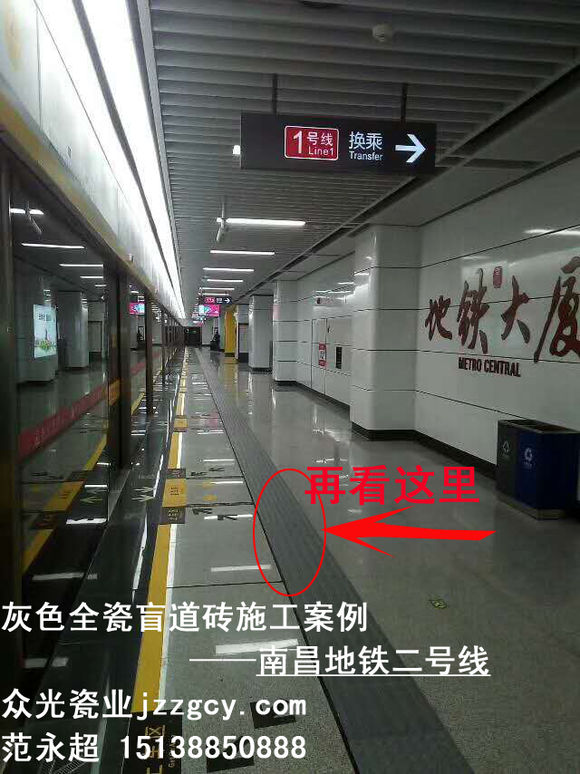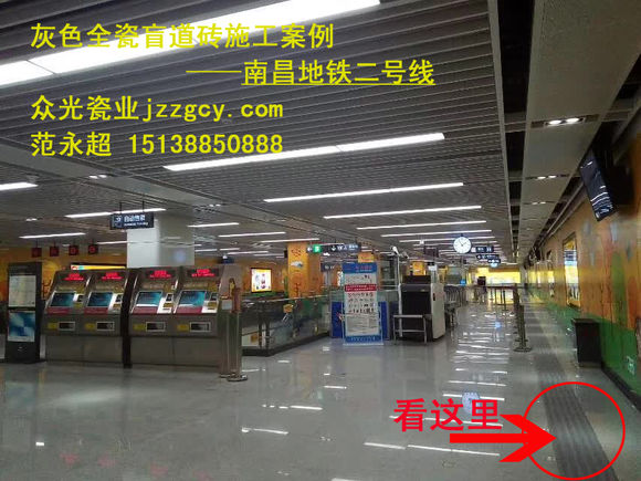 就在今天這個喜慶的日子里,激動人心的時刻到了,南昌地鐵二號線在經過建筑工人們近一年的艱苦奮戰,已于近日峻工完成,今天就是試運日,開通儀式將在地鐵大廈隆重舉行。該地鐵線路施工所使用的盲道磚均采用的是眾光灰色全瓷盲道磚,施工前期使用的大部分規格為400*400*20,后期有使用少量300*300*20的規格。眾光灰色全瓷盲道磚不只應用于南昌地鐵,北京地鐵、鄭州地鐵、武漢地鐵等國內許多城市的地鐵都采用的是眾光灰色全瓷盲道磚。眾光灰色全瓷盲道磚外觀大氣高雅,陶瓷材質防滑耐磨吸水率低,使用易清洗,是石材、塑膠、水泥、不銹鋼等材質不可比的。眾光盲道磚是按國家行業標準規定的盲道尺寸規格生產的,主要用于城市道路及火車站、汽車站、地鐵站臺、人行道上的鋪設,它是殘疾人指引行走無障礙的專用設施。